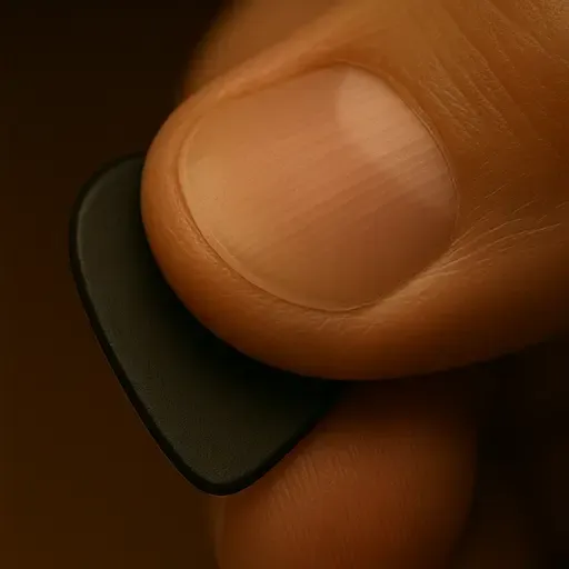 - Pouce et index : Cale le médiator entre ton pouce (à plat) et ton index (plié). La pointe dépasse de 2-3 mm.